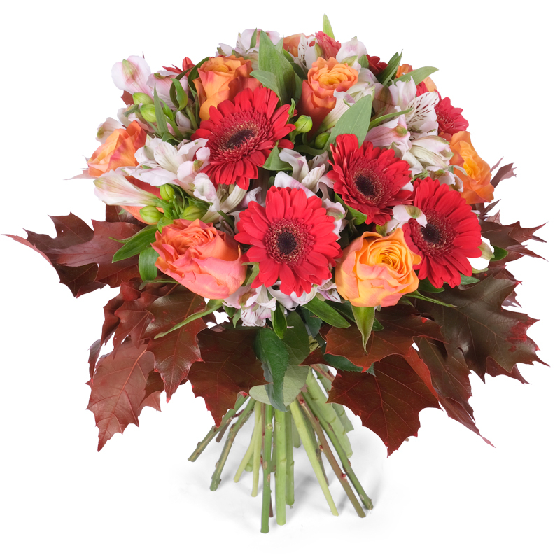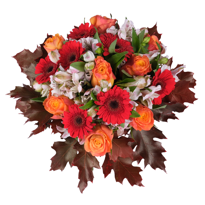 Ten bukiet łączy w sobie klasyczne róże, radosne gerbery i delikatne alstromerie. Uzupełniony liśćmi klonu tworzy harmonijną, pełną życia kompozycję. Idealny na każdą porę roku. Wnosi do wnętrza świeżość i elegancję. To piękny sposób, by okazać sympatię.